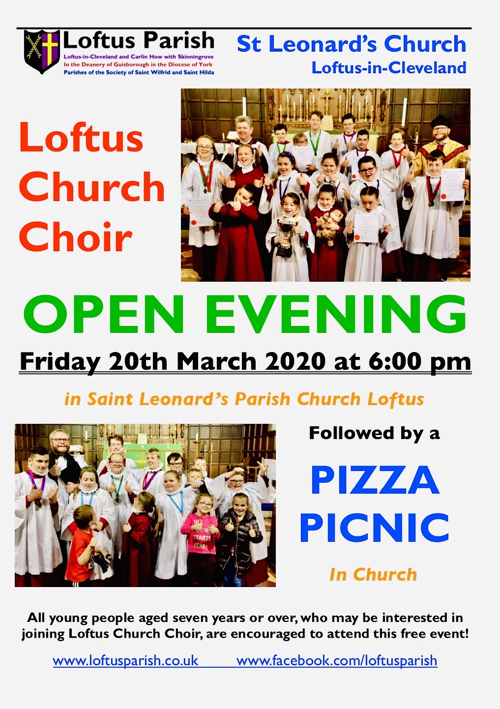 We are pleased to announce that there will be a Choir Open Evening on Friday 20th March 2020 from 6:00pm onwards at Saint Leonard’s Parish Church Loftus!