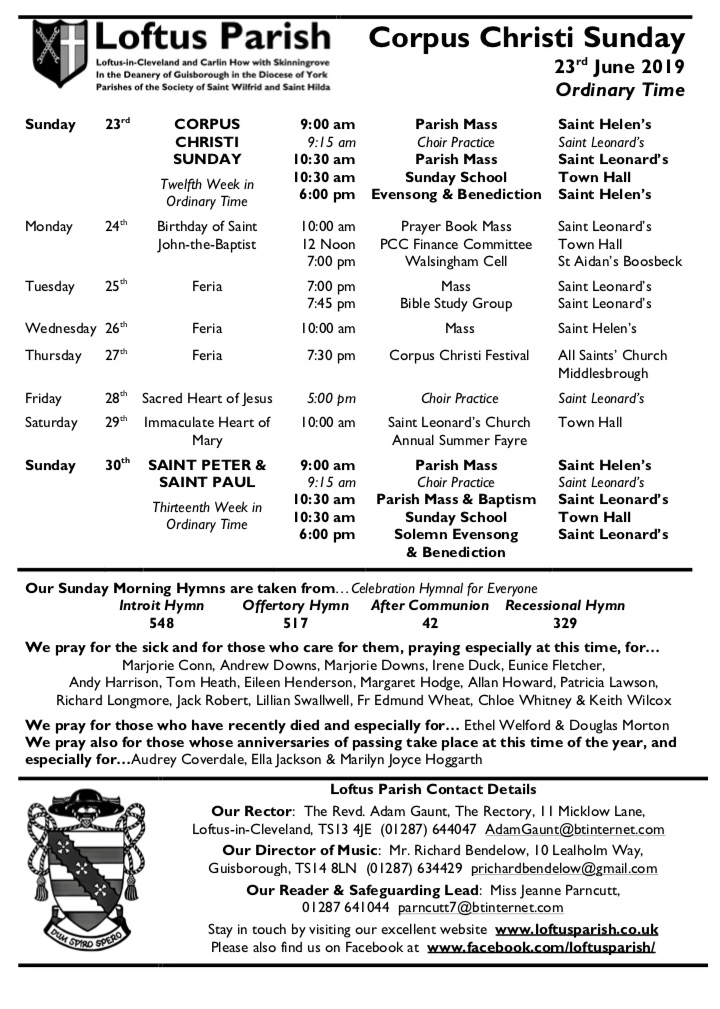 Newsletter – Corpus Christi Sunday 2019 June 22, 2019 News Share this:Click to share on Twitter (Opens in new window)Click to share on Facebook (Opens in new window) Related