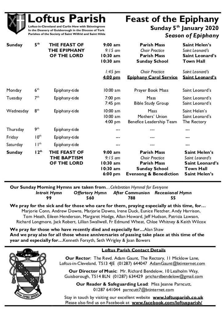 Newsletter – Epiphany Sunday 5th January 2020 January 4, 2020 News Share this:Click to share on Twitter (Opens in new window)Click to share on Facebook (Opens in new window) Related